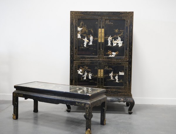 Cabinet formant meuble télé et table basse en bois laqué noir à décor de personnages asiatique en nacre. Accidents, 150x92x51cm.