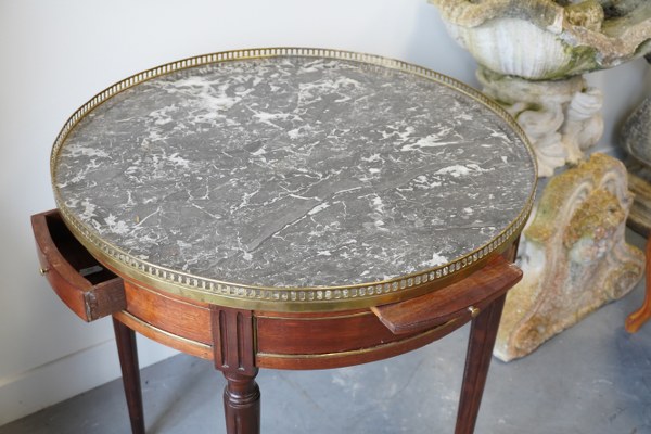 Table bouillotte dessus de marbre avec galerie en laiton ouvrant à 2 tiroirs et 2 tablettes. Hauteur: 75cm, diamètre: 69cm.