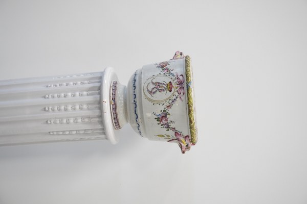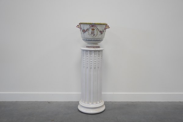Colonne en porcelaine avec cache-pot en faïence. Accidents et restaurations. Hauteur colonne : 70 cm. Hauteur cache-pot : environ 27 cm.