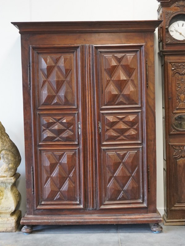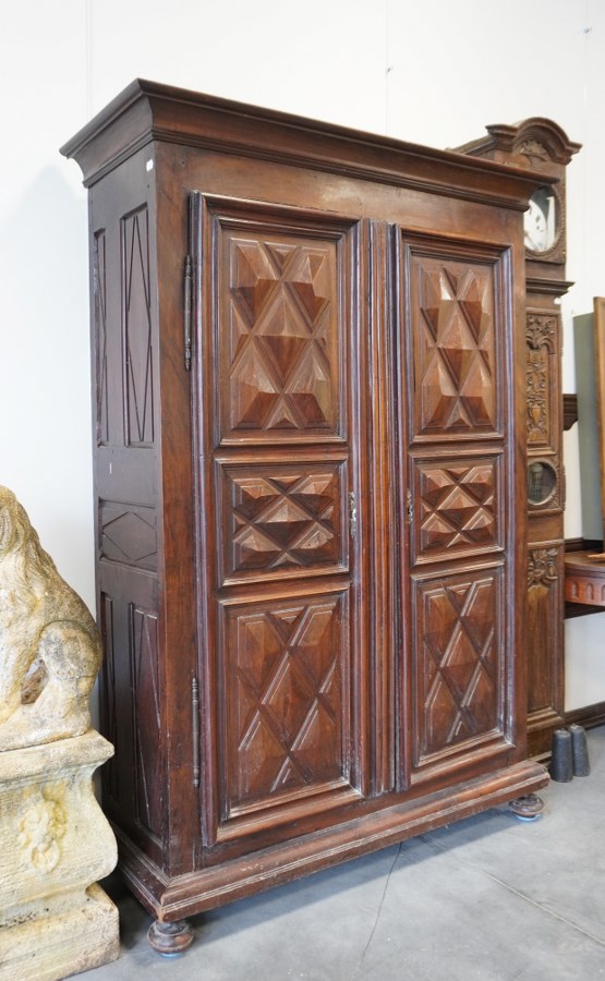 Armoire en chêne ouvrant à 2 portes pointe de diamant. 200 x 138 x 53cm.