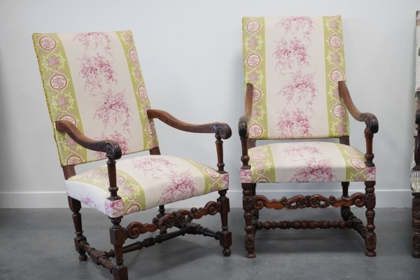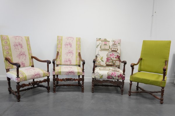 Suite de 4 fauteuils en chêne avec garniture en tissu vert et floral. Fin XVIIe siècle. Accidents.