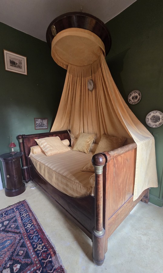 Lit empire à colonnes détachées en acajou et monture en bronze doré. Usures et insolation. On y joint un baldaquin circulaire. Vendu démonté.