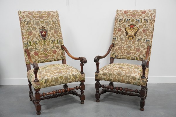 Paire de fauteuils en chêne mouluré, sculpté et tourné. Époque Louis XIV.