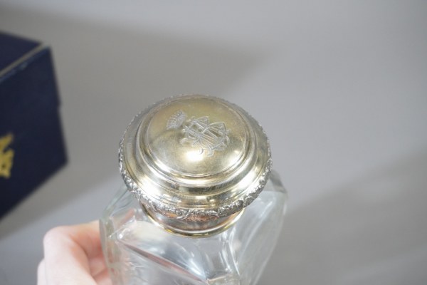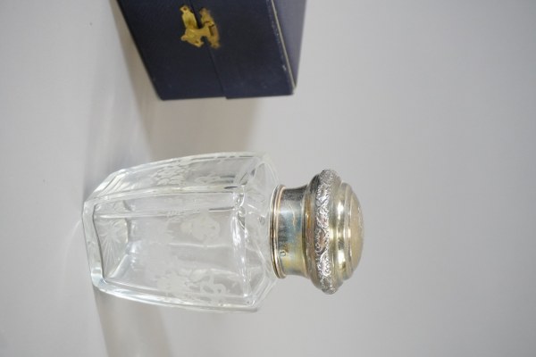 Flacon en verre gravé avec bouchon en argent dans son coffret. Hauteur : 13,5 cm.