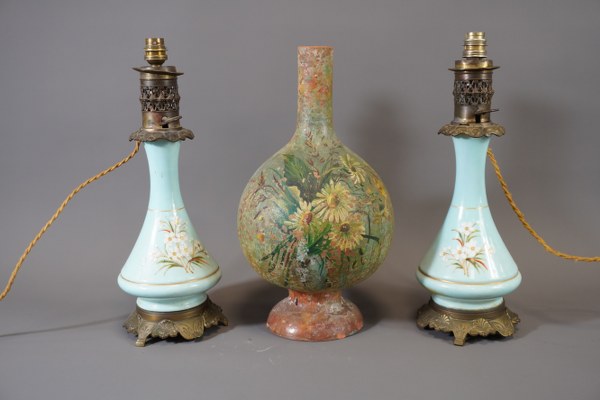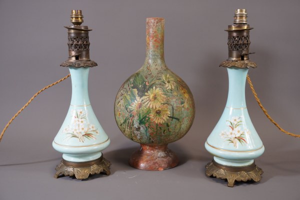 Paire de lampes à pétrole électrifiées monture en bronze et fut en opaline émaillé. Hauteur: 39cm. On y joint un vase bouteille en terre cuite peint à décor floral. Accidents.