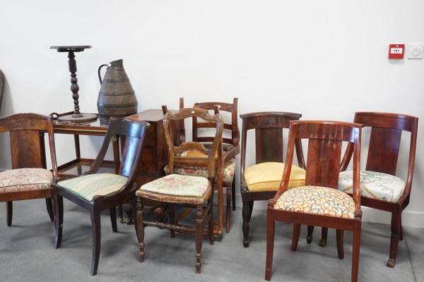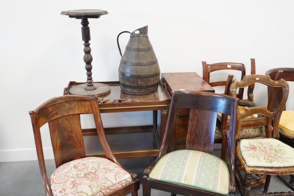 Ensemble de meubles comprenant, 1 desserte, 1 broc, 1 sellette, 8 chaises dépareillées, 1 meuble de rangement ouvrant à ,3 tiroirs. Dans l'état.