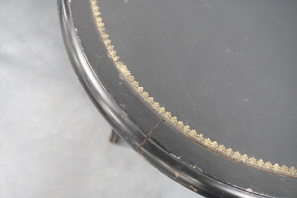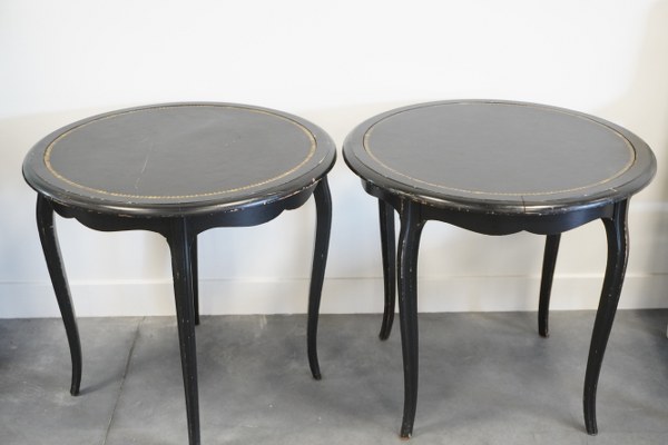 Paire de guéridons en bois noirci dessus de cuir noir. Usures. Hauteur: 64cm, diamètre: 70cm.