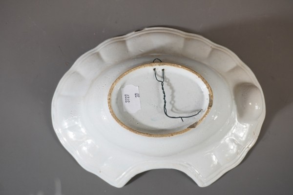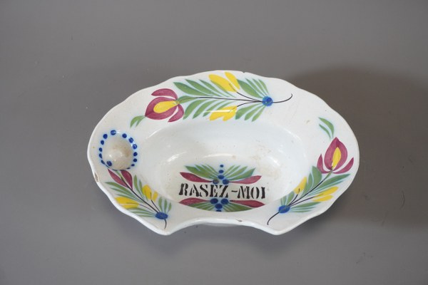 Plat à barbe en faïence. 21x26cm accident.