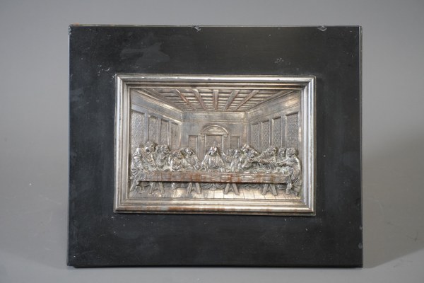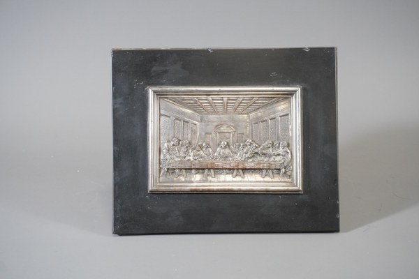 Plaque en relief en bronze argenté sur plaque de marbre noir et monture bronze doré. Marque C.R. 19x23cm.