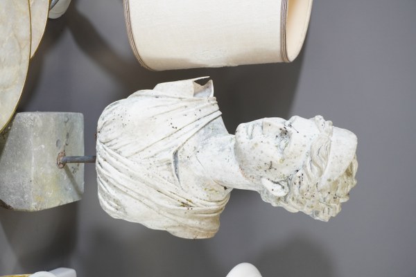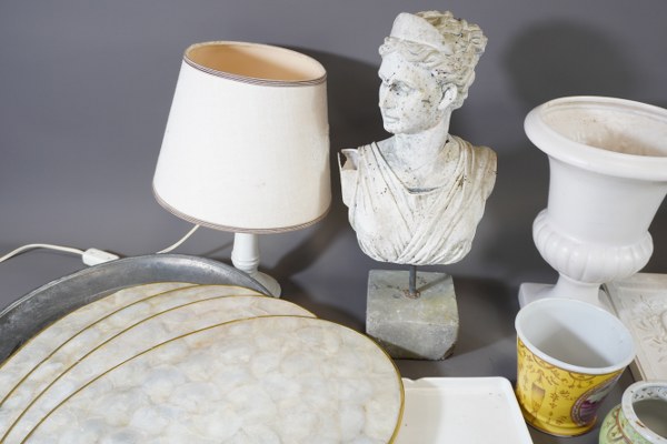 Lot comprenant un plateau en étain, set de table imitation nacre, buste de femme accidentée, 2 plaques avec relief en plâtre, 1 lampe et un lot d'abats-jour et 1 miroir en bois naturel. Accidents.