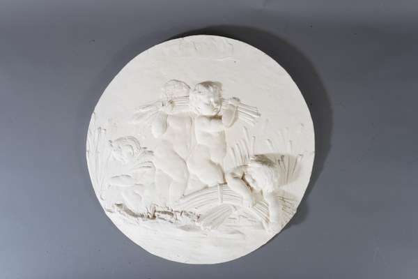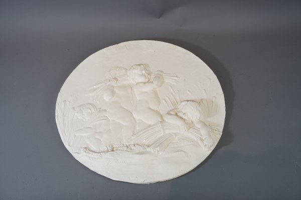 Dans le goût de Michel CLODION. Bas-relief circulaire en plâtre figurant des putti cueillant des épis de blé. Petits accidents. Hauteur : environ 50 cm.