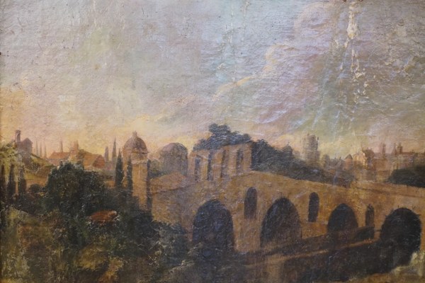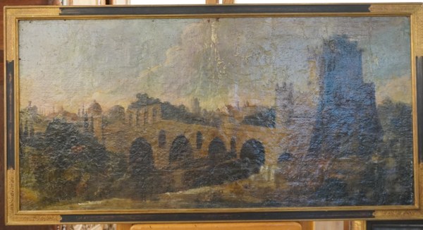 École du XVIIIème siècle, Vue arrangée du pont Roto. Huile sur panneau. 55x106cm. Petits manques.