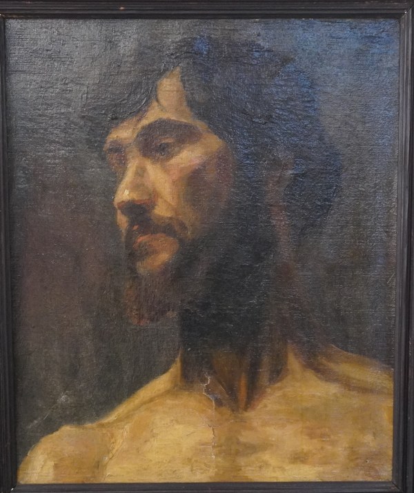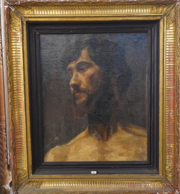 Huile sur toile, portrait d'homme dans un encadrement doré. Accident dans le centre de la toile. 66x57cm.