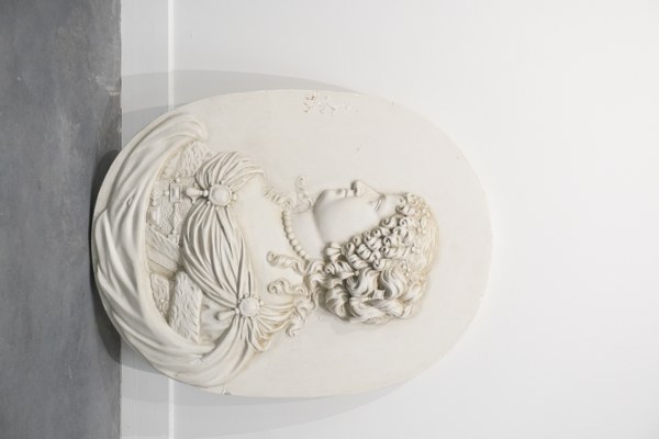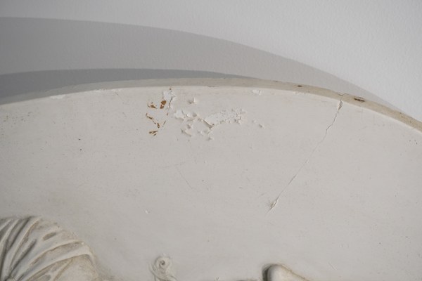 Médaillon relief représentant un buste de femme en plâtre. Accidents. 79x60cm.