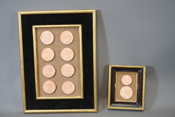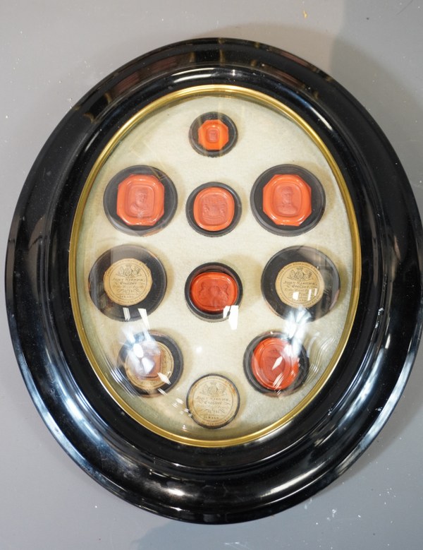 Cachet de cire dans un encadrement ovale avec verre bombé, on y joint 2 cadres avec médaillons en terre cuite. 40x30cm.