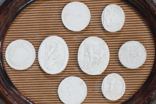 Souvenirs du Grand Tour. 8 Empreintes d'intailles en plâtre dans un encadrement ovale. 31x26cm.