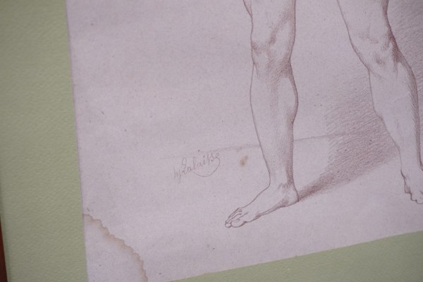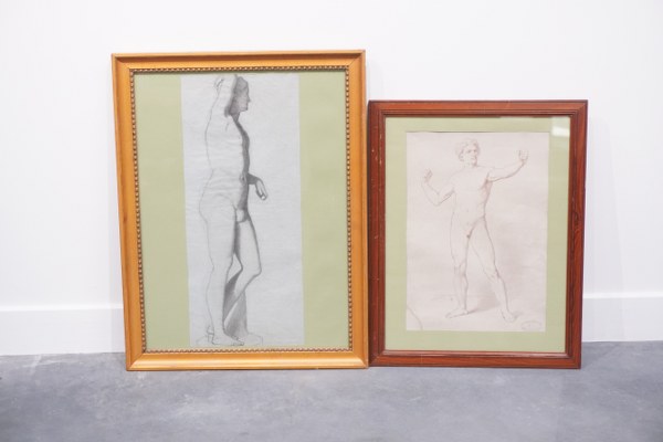 2 pièces encadrées sous verre dont un dessin représentant un nu et une lithographie d'après Lalaisse représentant une étude d'homme. Avec cadre : 67 x 50,5 et 56 x 44 cm.