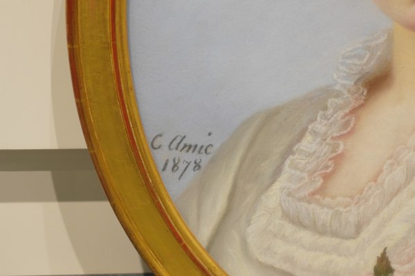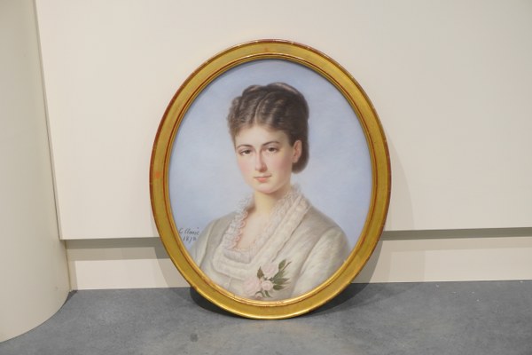 C. AMIC (XIXe siècle). Portrait à vue ovale d'une jeune femme. Pastel signé en bas à gauche et daté 1878. A vue : 53 x 44 cm.