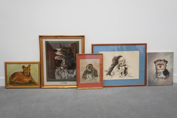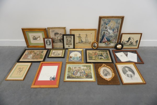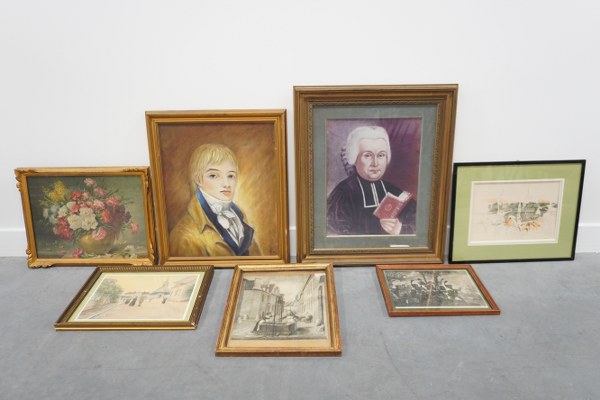 Lot de 7 pièces encadrées dont impression bouquet de fleurs,..