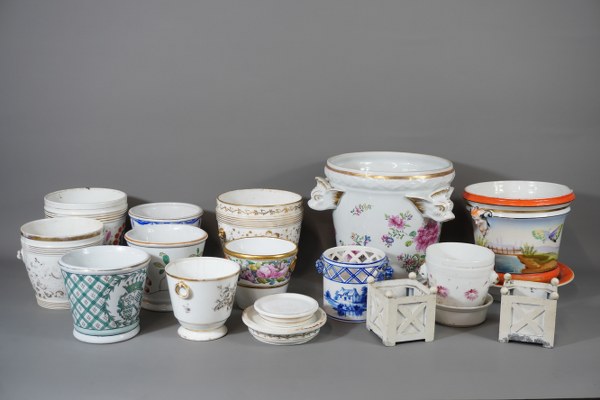 Lot d'une dizaine de cache pots en porcelaine. Dans l'état.