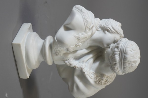 Couple en biscuit sur piédouche marque Houdon au dos. Hauteur:..