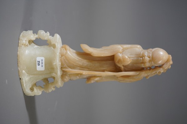 Statuette en pierre dure d'un personnage asiatique. Hauteur: 19cm. Eclats.