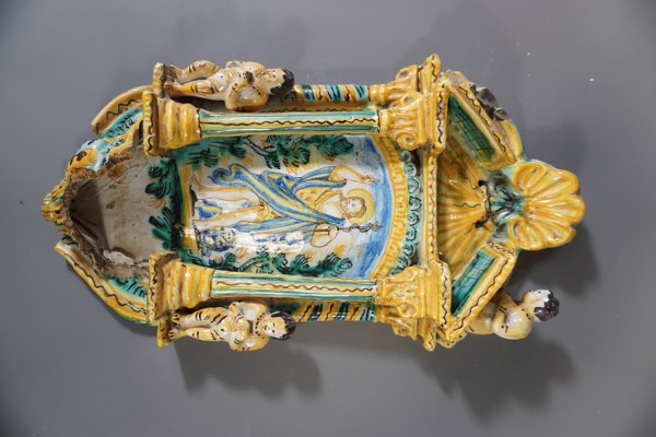 Bénitier en faïence à décor de bambin. Nombreux accidents 40x21cm.