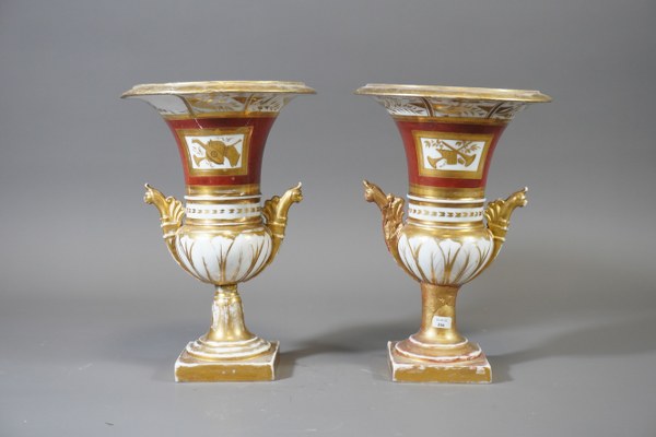 Paire de vases sur piédouche en porcelaine. Hauteur: 26cm. Accidents..