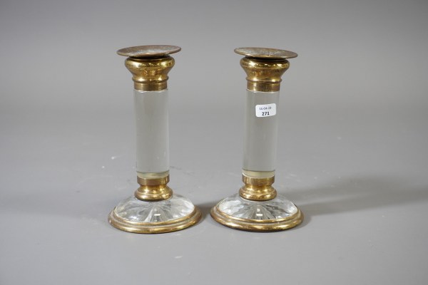 Paire de bougeoirs en verre monture laiton. Hauteur: 14,5cm. Une..