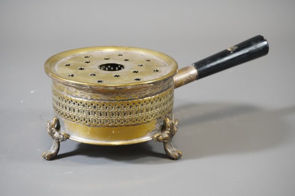 Chauffe plat sur pied en laiton avec manche.