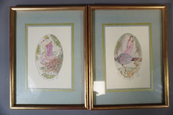 2 Pointes sèche de femme sur fond floral encadrées. 25x19cm