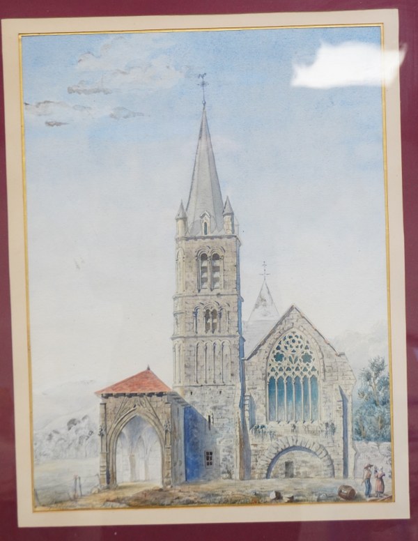 Ecole du XIXe siècle. Eglise. Aquarelle signée (G. Delaroche ?)..