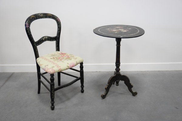 Guéridon Napoléon III avec incrustation de nacre et 1 chaise..