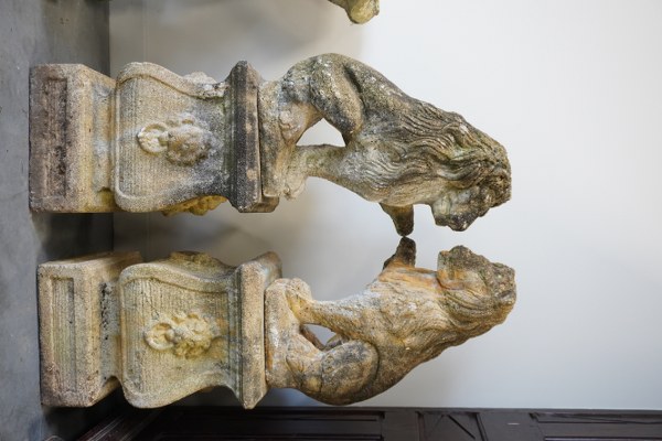 Paire de lions sur plots en pierre reconstituée. Hauteur: 111..