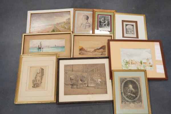 Lot d'une dizaine de pièces encadrées dont gouaches, peintures, reproductions,..