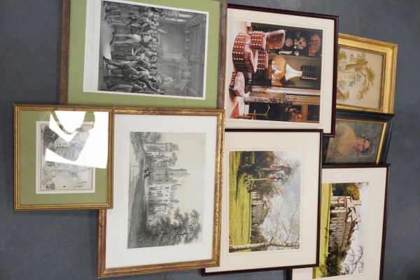 Lot d'une dizaine de pièces encadrées dont gravures, reproductions, photos....