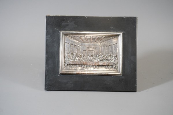 Plaque en relief en bronze argenté sur plaque de marbre..