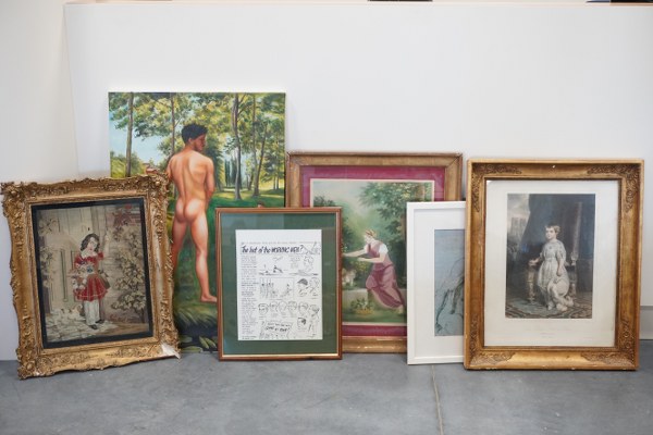 6 Pièces encadrées dont gouache, reproductions, tapisserie sous verre....