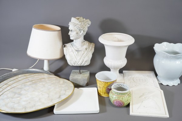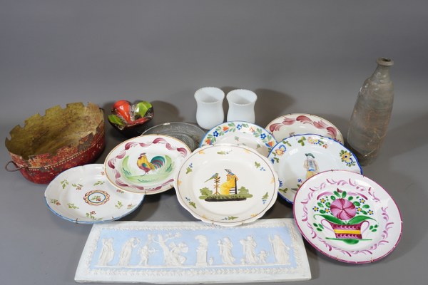 Lot d'assiettes décorative, rafraichissoir en tôle, bouteille en céramique. Accidents..