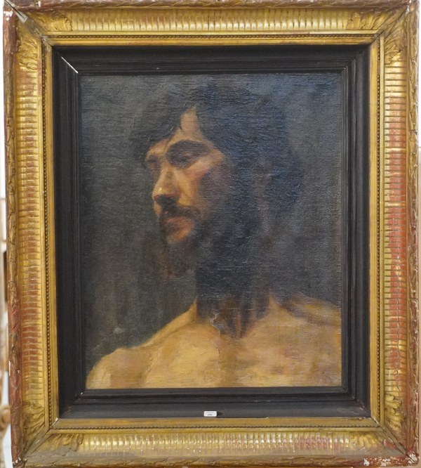 Huile sur toile, portrait d'homme dans un encadrement doré. Accident..