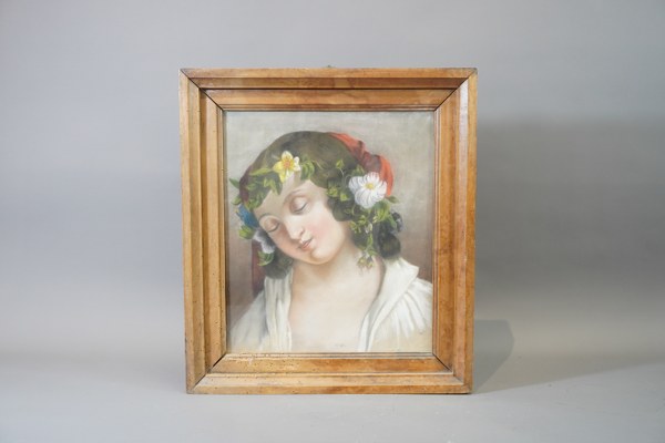 Pastel, portrait d'une jeune femme à la couronne fleurie. encadré..