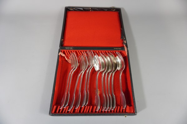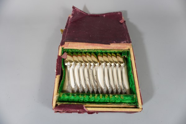 12 Petites cuillères en argent vermeil. Poids: 240gr. Boite endommagée.