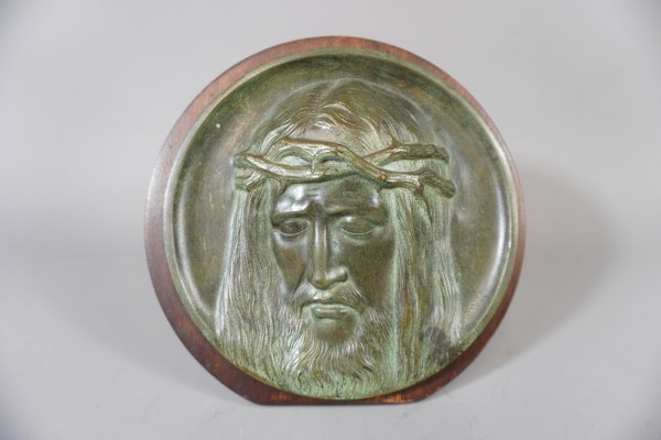 Plaque en bronze représentant le Christ sur support bois. Diamètre:..