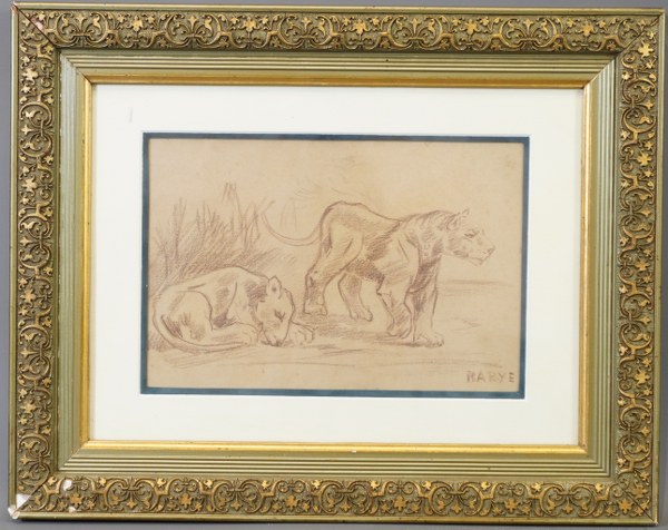 D'après Barye. Deux lionnes, crayon sur papier. 17,5 x 27,5..
