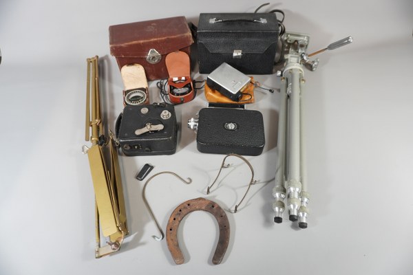 Lot d'appareils de photographie avec piètement, caméra, appareil photo.