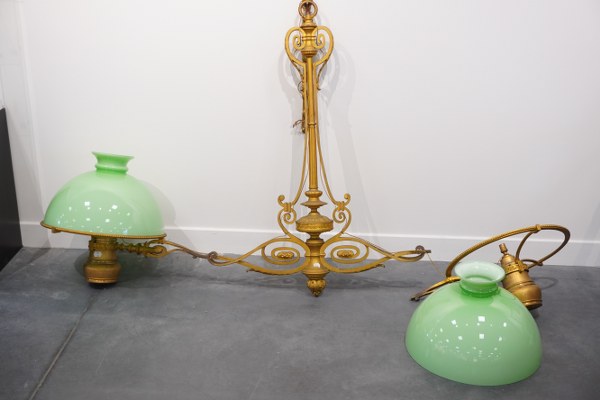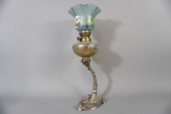 Lampe à pétrole Art Nouveau. Accident au verre supérieur. Usures...