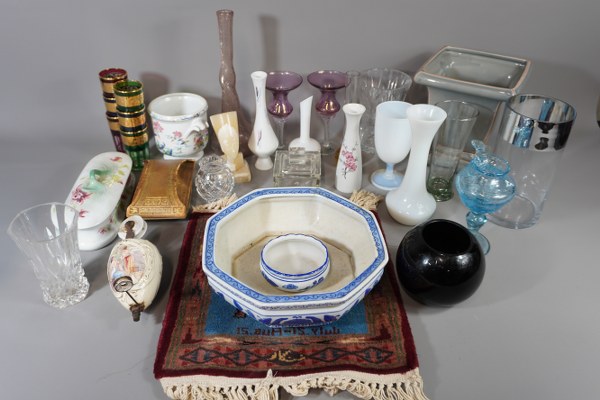 Lot de verreries comprenant des vases, verres, bougeoirs... Buvard, poulie..