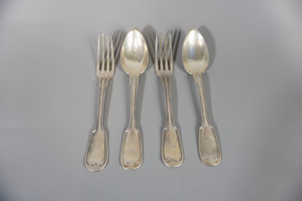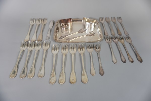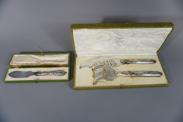 Couverts en argent fourré et un couteau dans leurs écrins...