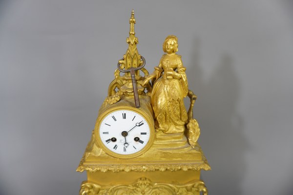 Pendule en bronze doré décor à la femme galante. 39x26cm.