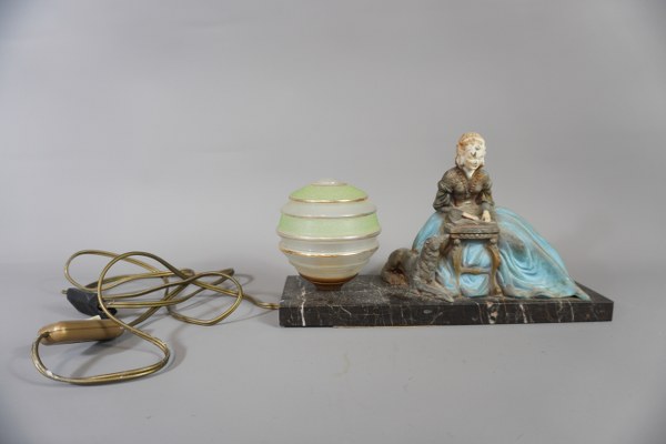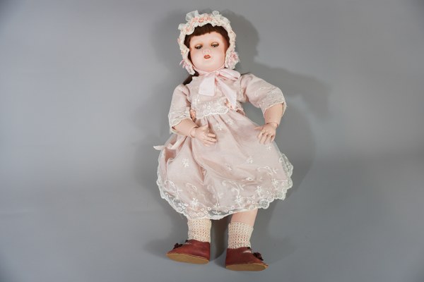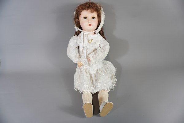 Poupée en carton craquelé aux yeux fixe bleu, bouche ouverte,..
